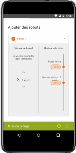 Pour piloter le robot, il y a deux choses. La première c’est une télécommande qui sert à déplacer le robot. Ensuite, on a accès sur notre smartphone à une application toute simple qui nous permet de programmer la mission, sélectionner la cartographie, régler la vitesse d’avancement etc …